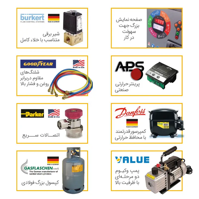 - قابلیت انجام عملیاتهای بازیافت گاز، بازیافت روغن، وکیوم، تست نشتی، شارژ گاز، تزریق روغن، تزریق مایع نشتیاب UV، به روش تمام اتوماتیک یا دستی